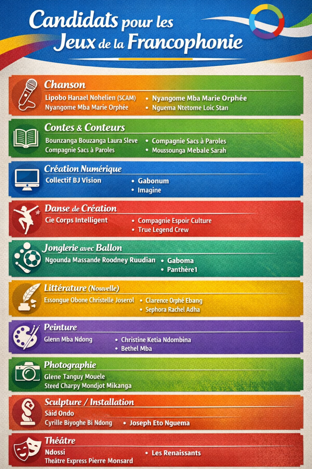 Au total, 31 candidats, répartis dans dix (10) disciplines artistiques, ont été sélectionnés. Cette liste sera soumise au Comité international des Jeux de la Francophonie (CIJF) avant le 30 juin 2026, date limite fixée pour la validation des participations.