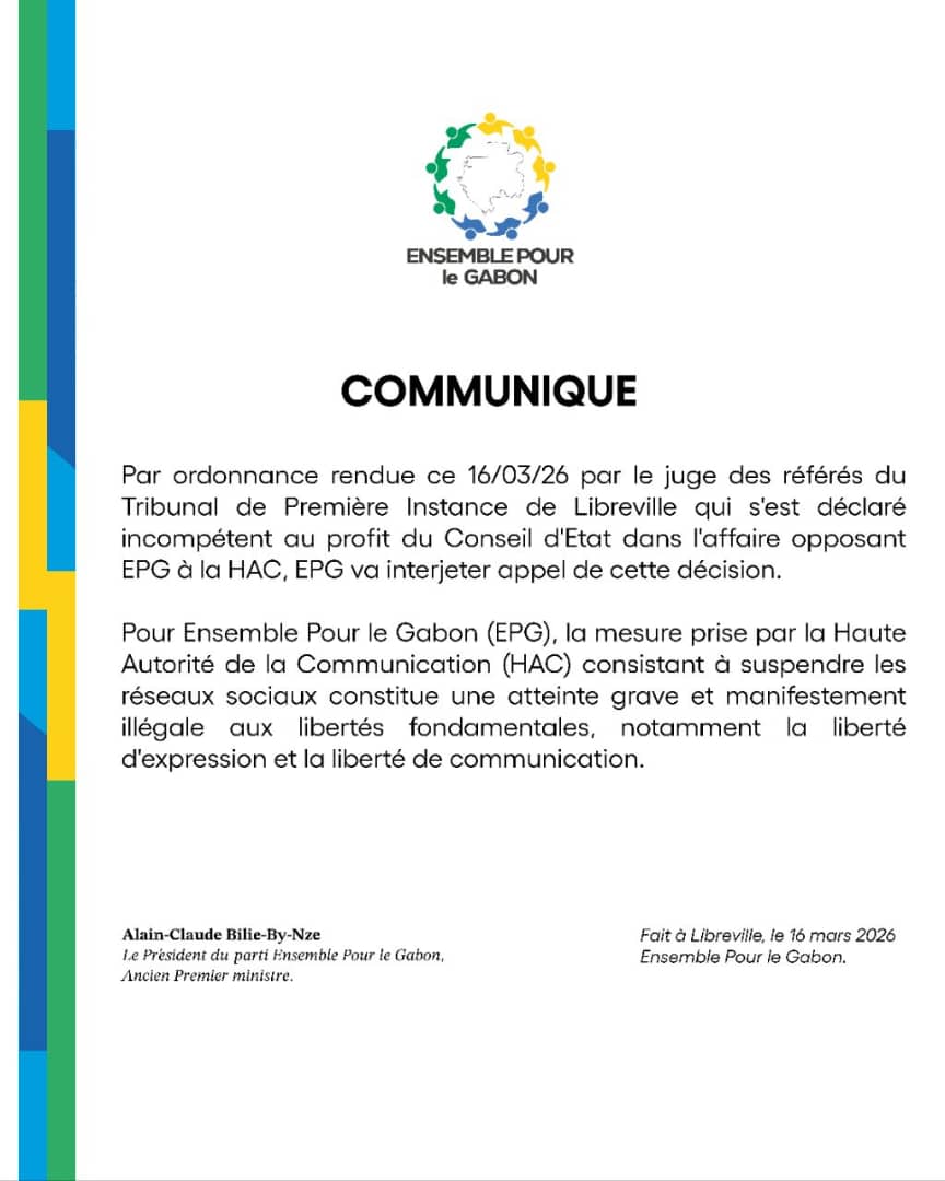« Par ordonnance rendue ce 16 mars 2026, le juge des référés du Tribunal de première instance de Libreville s’est déclaré incompétent au profit du Conseil d’État dans l’affaire opposant EPG à la HAC. EPG va interjeter appel de cette décision. »